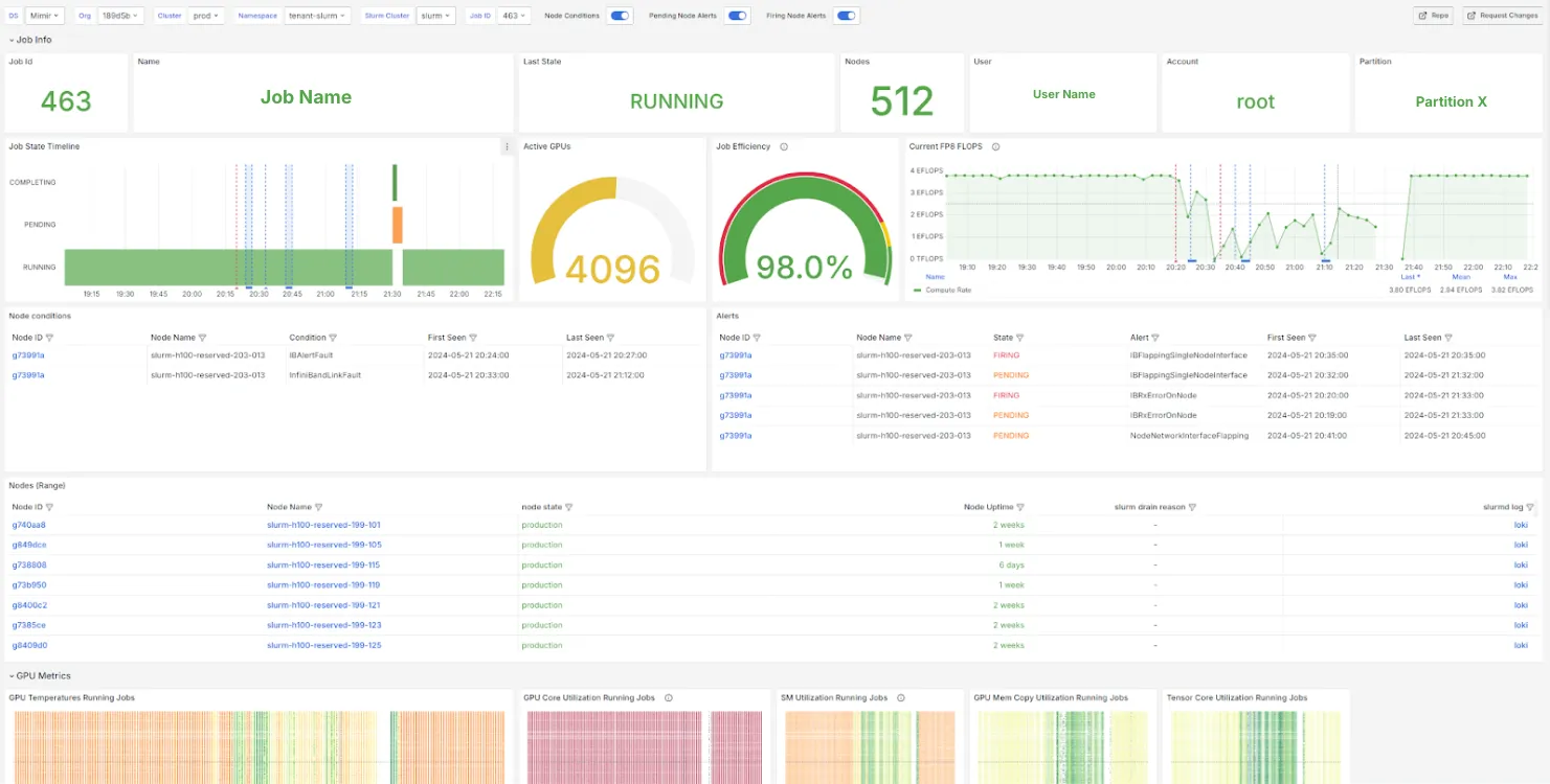 CoreWeave Observability Services provide access to a rich collection of node and system-level metrics to complement the capabilities of Mission Control. Unhindered by a legacy software stack that limits capabilities of other AI infrastructure services providers, CoreWeave customers have access to detailed node-level and system-level metrics that quickly identify system faults and restore system-level performance. Faults can occur for various reasons, such as bad user configuration (memory allocation issues), misbehaving software updates, server component malfunctions, or issues in the high speed node-to-node network. Customers can collect and receive alerts on metrics across their fleet, with dashboards that visualize either the entire cluster or individual jobs, and identify root-cause issues in a matter of minutes. The following image provides an example of real-time dashboards that customers can create using CoreWeave Observability Services.