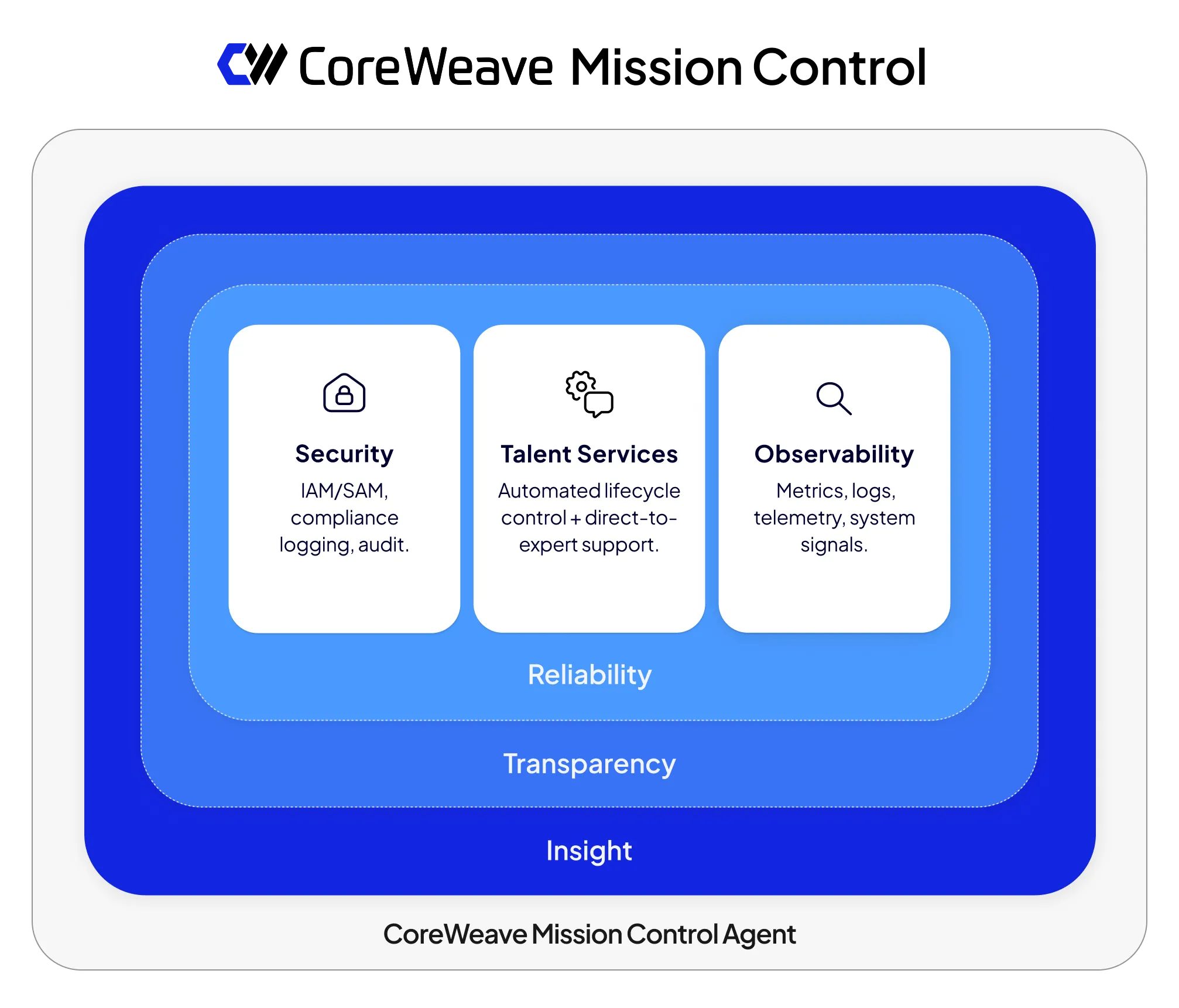 CoreWeave Mission Control runs through our entire stack, from foundational infrastructure up through observability, security, and agent workflows. It connects all of the critical layers of CoreWeave Cloud in one place—giving you real-time visibility into GPU, network, and storage behavior. It also enables you to see how systems are performing and keep them stable with secure controls for AI workloads. And it unifies identity and access controls, compliance logging, and audit history, giving you a complete, clear, and defensible record of activity across your environment.